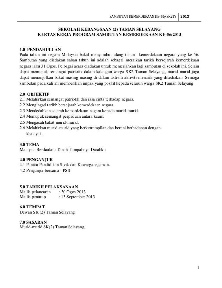 Pada hari ini, cikgu press ingin berkongsi kertas kerja sambutan bulan kemerdekaan di peringkat sekolah untuk rujukan semua guru. Muat turun kertas kerja, koleksi buku program, brosur & pemplat bulan kemerdekaan. Contoh kertas kerja sambutan bulan kemerdekaan. Penyampaian sijil nilam pertama sesi 2012; Janji ditepati 17 julai 14 september 2010 skpbp(1) 1.0 pengenalan hari kemerdekaan negara yang di sambut setiap tahun mempunyai kebaikan dan kepentingannya yang tersendiri.